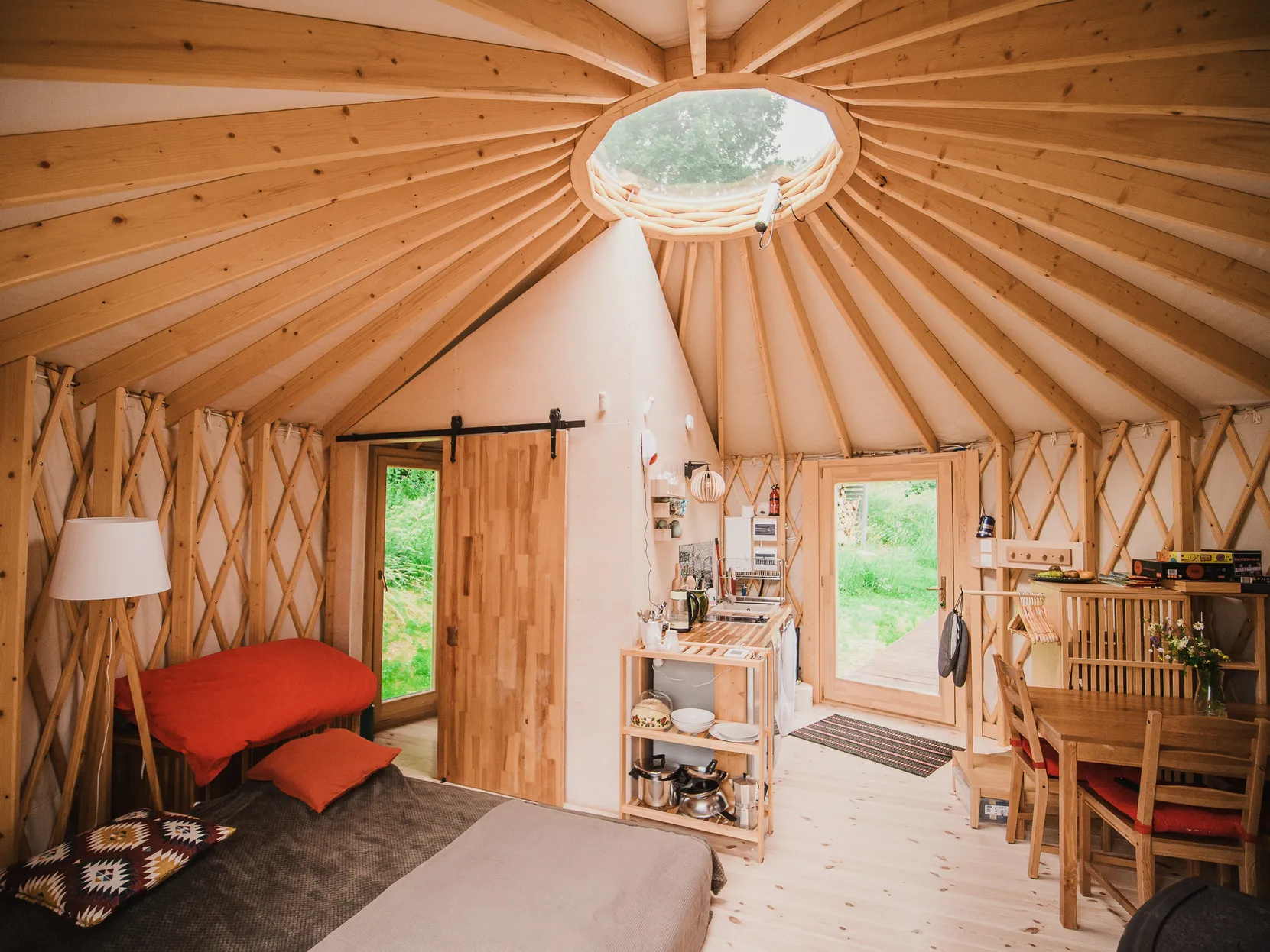 Jurta (25 m²) będzie najbardziej komfortowa dla 2 osób, ale mogą się tu zmieścić nawet 4. W ciepłych miesiącach (od maja do września) możesz dostawić namiot dla 2 osób za dopłatą (max. 2 namioty). W jurcie jest aneks kuchenny z płytą, lodówką, zmywarką, czajnikiem i przyborami kuchennymi.