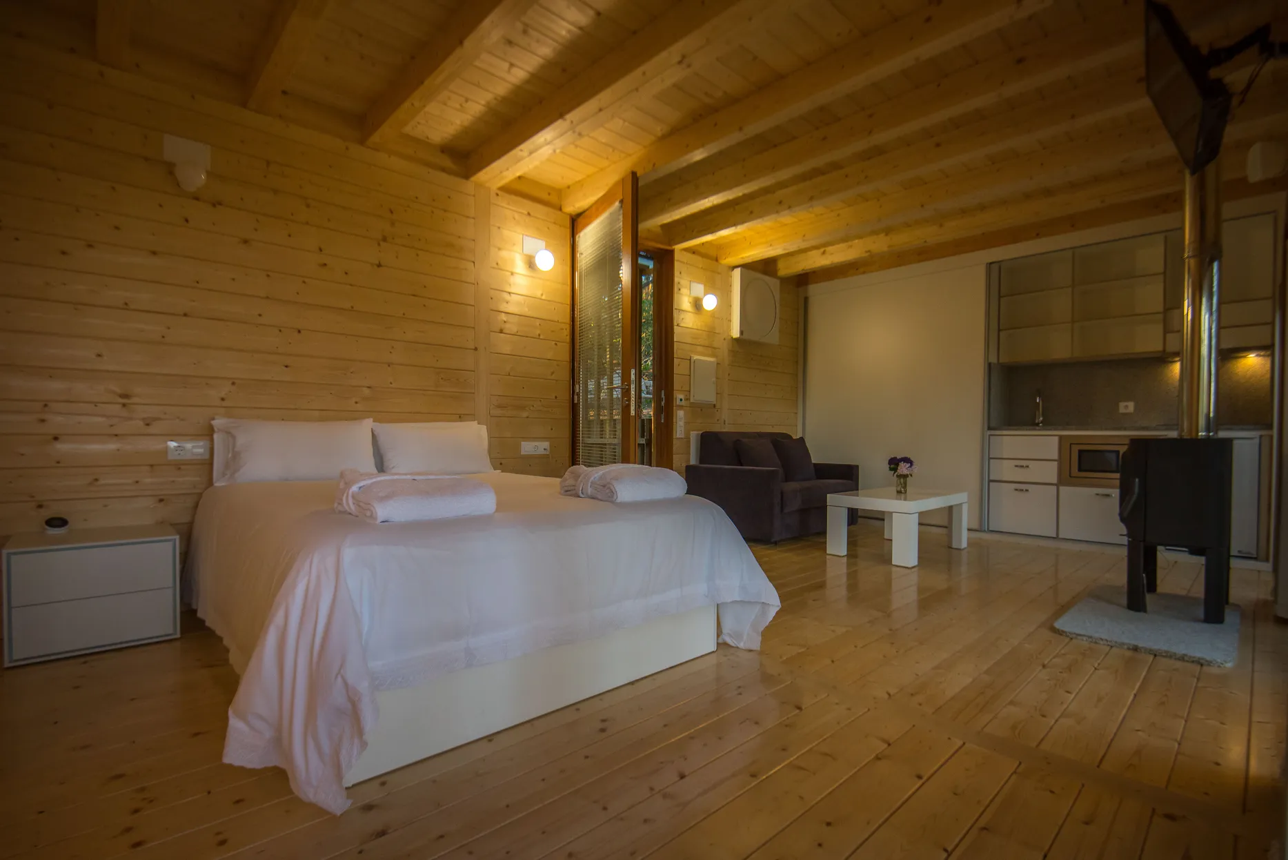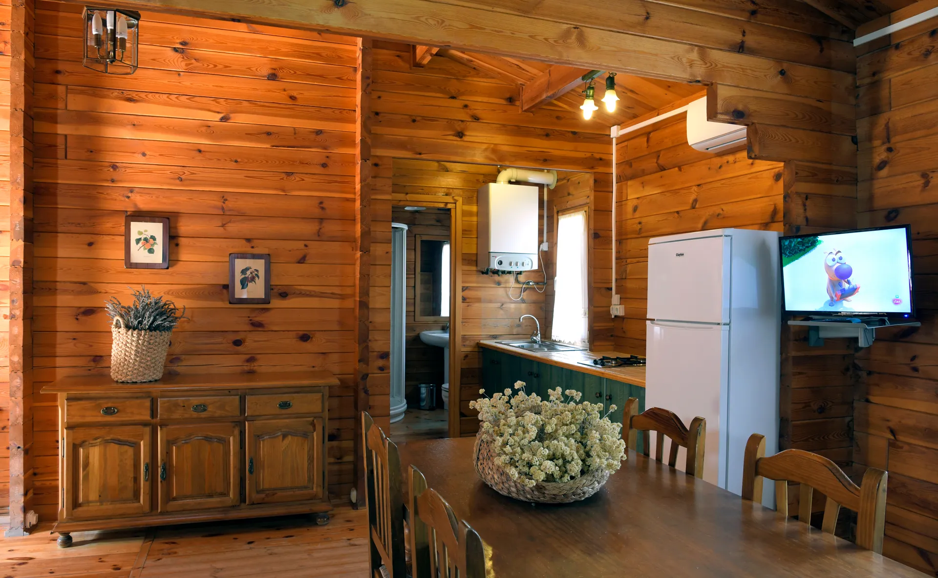 W ofercie są drewniane domki różnej wielkości dla 2-12 osób. W każdej sypialni jest łóżko i szafa, a w salonie rozkładana kanapa i stół. Każdy domek ma prywatną łazienkę z prysznicem, klimatyzację i ogrzewanie. Jest w nich też prywatna kuchnia z kuchenką, lodówką i zlewem. Pościel, prześcieradła, ręczniki i środki czystości nie są wliczone w cenę pobytu – możesz je zamówić za dopłatą przy dokonywaniu rezerwacji.