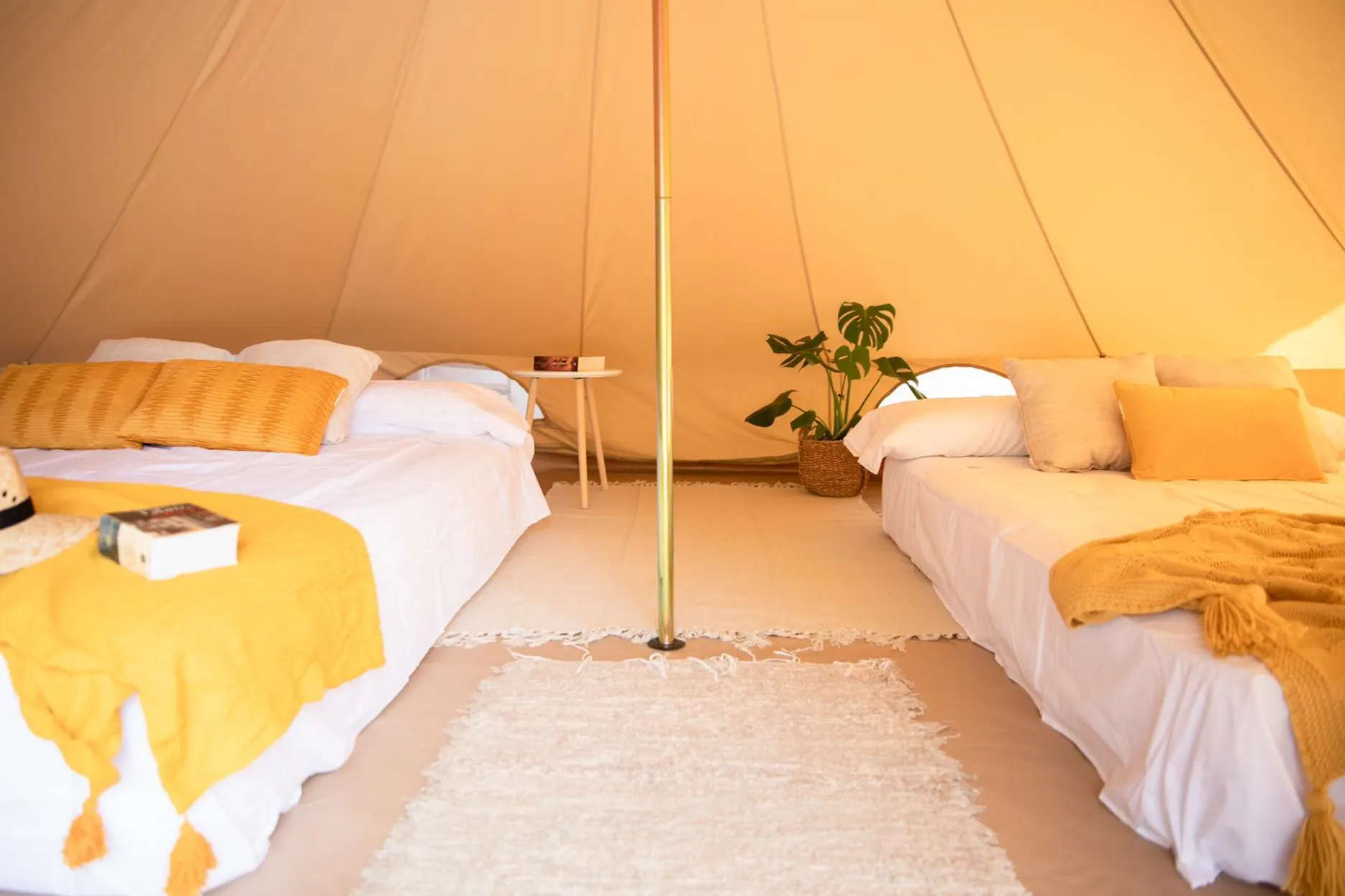 Ten camping w Hiszpanii to dobre rozwiązanie dla osób, które szukają miejsca na wyłączność z poczuciem pełnej izolacji od reszty świata w otoczeniu natury. Ten duży, 4-osobowy namiot leży na działce o powierzchni 500m². W środku są 2 podwójne łóżka.