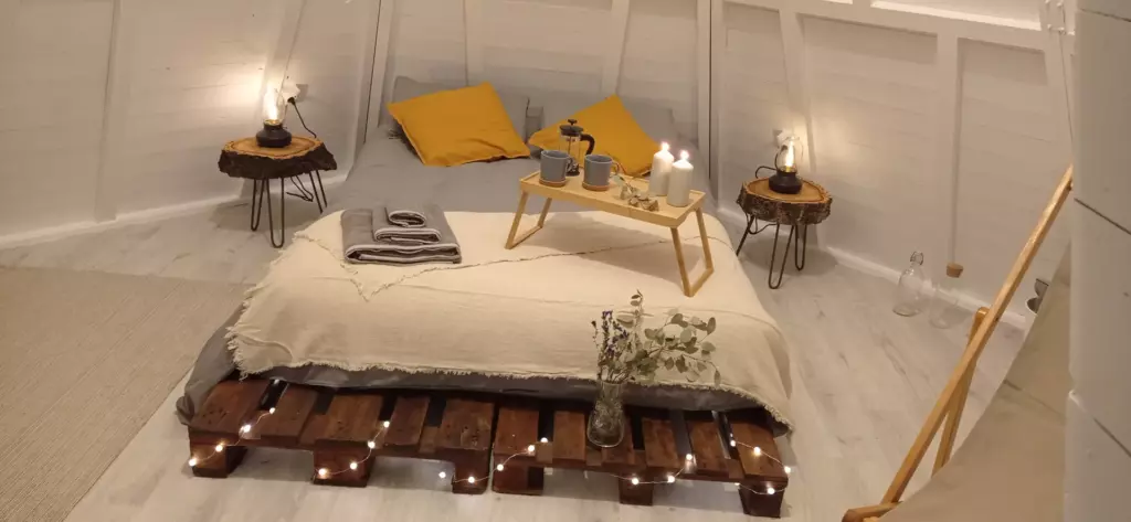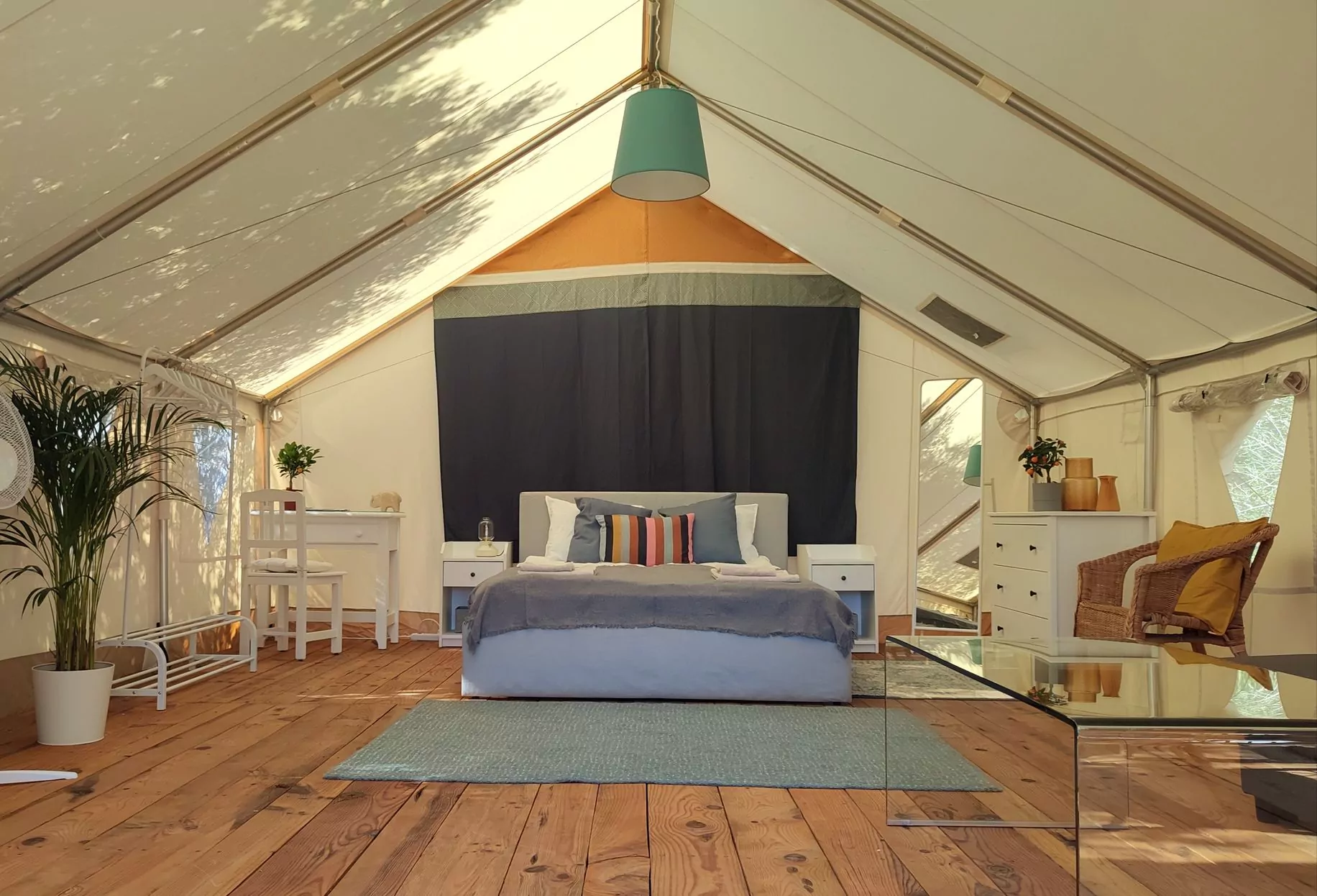 Do wyboru masz 6 płóciennych namiotów o powierzchni 19-30 m², urządzonych tak przytulnie, że możesz poczuć się w nich jak w domu. W każdym jest wygodne podwójne łóżko, komoda na ubrania, przestrzeń do pracy i część wypoczynkowa z kanapą. Są dostępne łóżeczka dziecięce. Jest tu też mała strefa kuchenna z lodówką i podstawowymi naczyniami i sztućcami. Jedyną wadą mogą być nieproszeni goście w postaci owadów, ale taki już urok mieszkania na łonie natury. :)