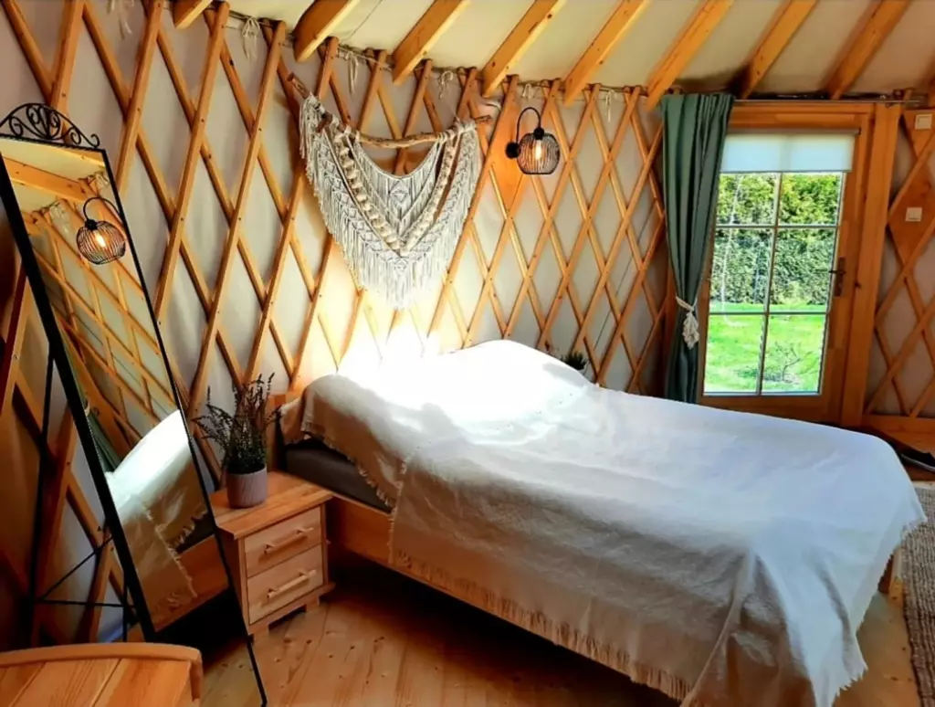 Nowocześnie urządzone jurty pomieszczą max. 5 osób. W każdej z nich jest aneks kuchenny wyposażony w płytę indukcyjną, lodówkę, czajnik i przybory kuchenne. W prywatnej łazience będziesz mieć dostęp do prysznica, ręczników i suszarki do włosów. W jurtach jest telewizor i działa Wi-Fi. W każdej z nich będziesz mieć taras z meblami ogrodowymi i zestawem do grilla.