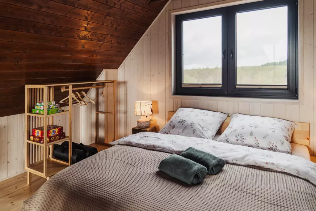Domek (70 m²) pomieści max. 5 osób. Są tu 2 sypialnie, w każdej jest podwójne łóżko, a dodatkowa osoba zmieści się na rozkładanej kanapie. Posiłki przygotujesz w kuchni z płytą indukcyjną, piekarnikiem, lodówką, ekspresem do kawy, czajnikiem i przyborami kuchennymi. W prywatnej łazience jest prysznic, pralka, suszarka do włosów i ręczniki. Telewizję obejrzysz w jakości 4k na ekranie 55’; w obiekcie działa też Wi-Fi. Z udogodnień dla rodzin jest krzesełko i wanienka dla dziecka. Domek jest ogrzewany i klimatyzowany, więc sprawdzi się na reset o każdej porze roku.