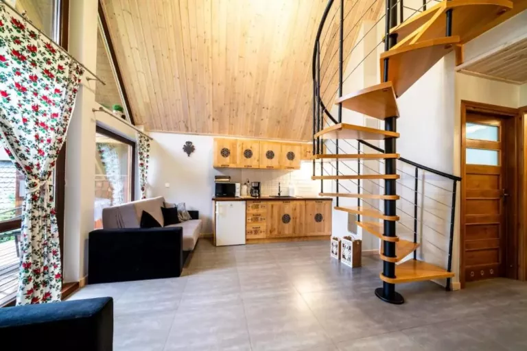 Domki prezentują się niezwykle przytulnie. W dzień przyjazdu na gości czeka rozpalony kominek, co na wstępie robi pozytywne wrażenie. Każdy domek pomieści max. 8 osób. Na piętrze znajdują się 2 oddzielne sypialnie (każda z łóżkiem 2-osobowym i 1-osobowym).