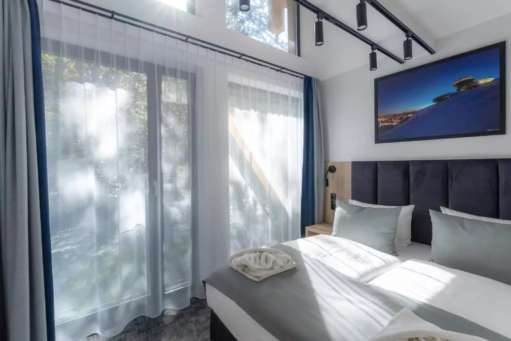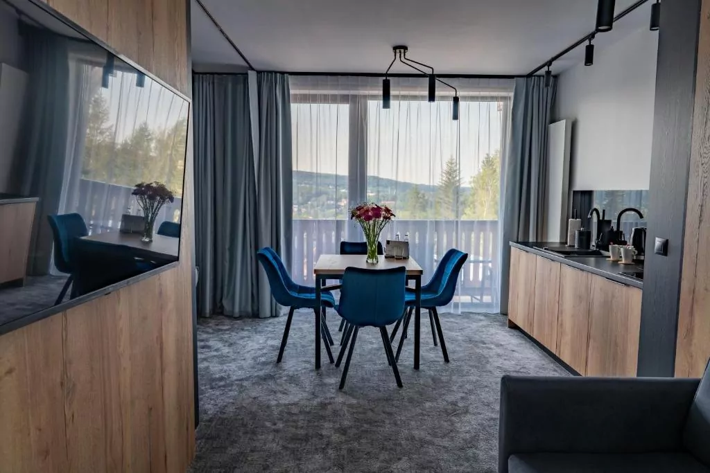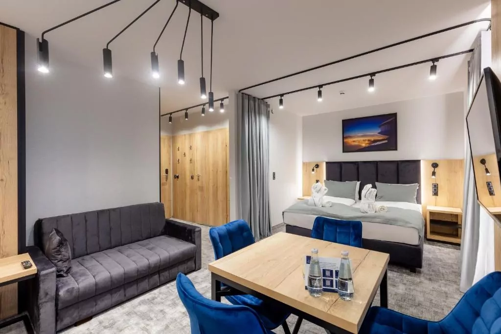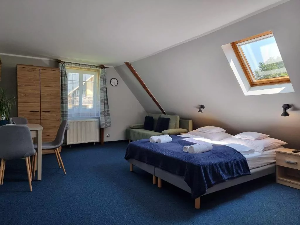 Wynajmiesz tu nowocześnie urządzone apartamenty dla 2-3 osób. W każdym jest prywatna łazienka z prysznicem, aneks kuchenny z płytą, lodówką, czajnikiem i naczyniami. Apartamenty są ogrzewane, mają bezpłatne wi-fi i telewizory, a dostęp do sauny jest w cenie. W obiekcie, oprócz SPA, znajdziesz restaurację i prywatny parking (za dopłatą).