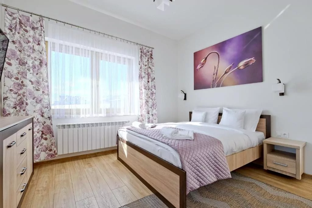 - nowoczesny apartament – Przy Stoku Apartamenty są przestronne, stylowo urządzone i mają w pełni wyposażoną kuchnię. Z okien widać góry. Do term dojdziesz w 2 min, a do stoków Kotelnicy w ok. 10. Dużym plusem jest prywatny parking i spokojna okolica.